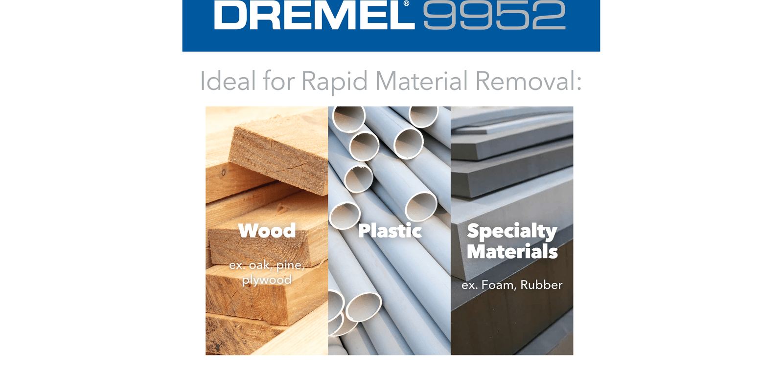 2X faster material removal compared to Dremel 9910¼” wide ‘small taper’ profile allows for accessibility into small, hard to reach areas and for carving deep holes into your workpieceHardened stainless steel teeth allow for aggressive carving and high material removal rates in wood, plastic, foam, and rubber Thin and accurate lines can be carved with the tip of the 9952Can both aggressively remove material and smooth the workpiece to a finish ready for final sanding