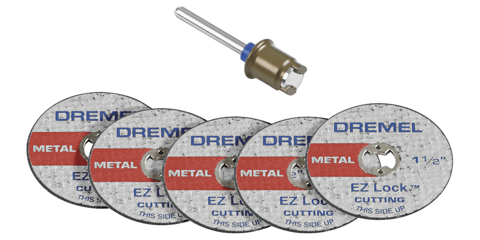 Turn your Dremel rotary tool into a powerful cutting machine with the EZ lock™ starter kit which includes EZ402 mandrel and 5 EZ456 fiberglass reinforced cut-off wheelsThey're reinforced with fiberglass for increased durability to cut, trim and groove into a variety of metals including hardened steelIdeal for easily cutting or slotting bolts, screws or sheet metal, thin wood, ceramic and plasticDremel EZ406-02 includes one EZ402 EZ lock™ mandrel and five EZ456 fiberglass reinforced cut-off wheelsFor use with Dremel EZ402 mandrel only, the patented EZ lock™ system making accessory changes 6X faster than using a standard mandrelWorking diameter: 1-1/2" (38.1 mm), blade thickness: .045” (1.1mm), blade material: fiberglassDremel accessories are also color-coded into usage categories, to find more cutting accessories look the red color code